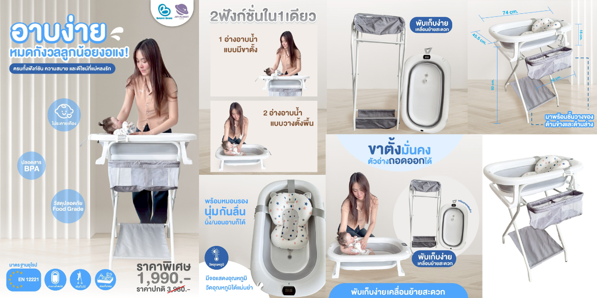 อาบน้ำลูก...ง่ายขึ้นอีกขั้น! "สะดวก สบาย ไม่ต้องก้มอาบ ใข้งานได้ 3 รูปแบบ อ่างพร้อมขาตั้ง อ่างอาบน้ำแบบวางพื้น / พับเก็บได้ มีที่วัดอุณหภูมิ